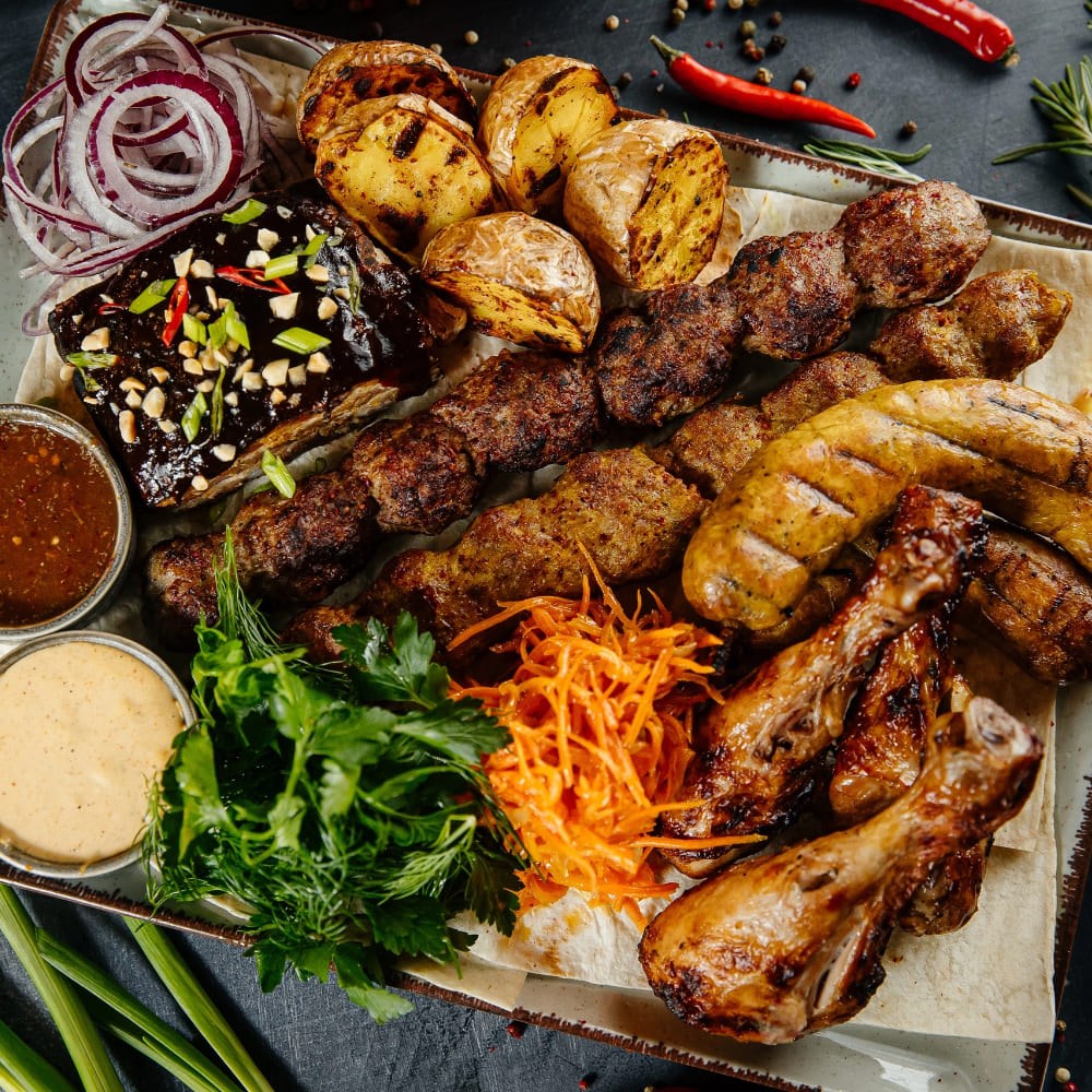 Состав: люля-кебаб из индейки, люля-кебаб из баранины, купаты куриные, шашлык из куриных ножек, печеные свиные ребра, морковь по-корейски, печеный картофель, лаваш, лук маринованный, соуса