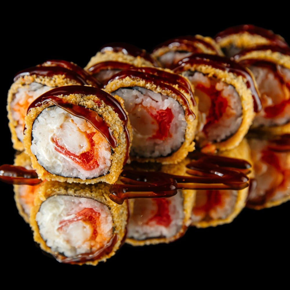 Рис, нори, сыр творожный, креветка отварная, икра масаго, имбирь маринованный, соус унаги, соус спайси