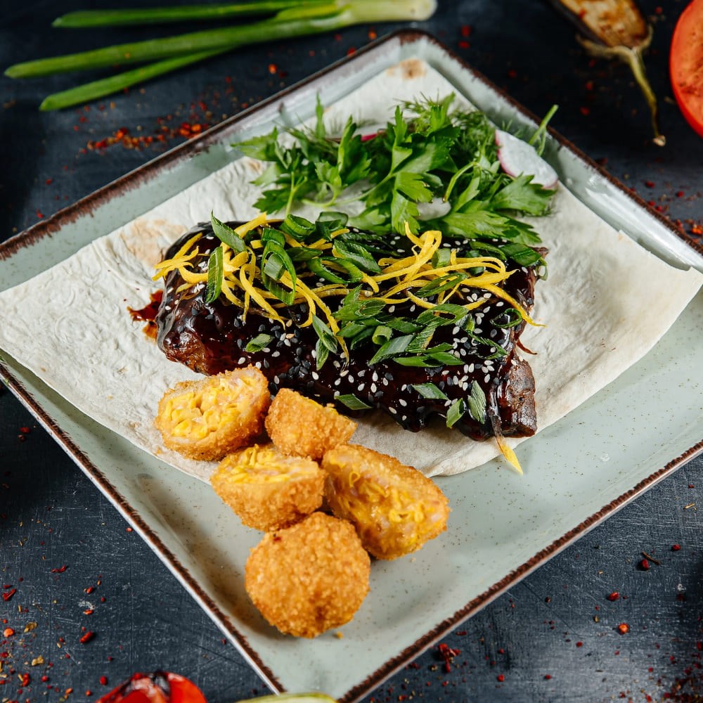 Рёбра подаются с Аранчини из кукурузы с добавлением бекона и сыра