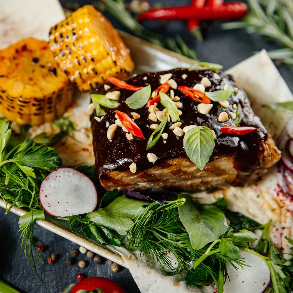 Состав: соус на выбор: BBQ, медово-горчичный, терияки, копченая вишня, сладкий чили. Подается с кукурузой, лавашем, маринованным луком, соусом на выбор.