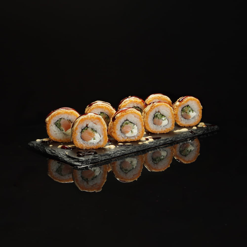 Рис, водоросли нори, сыр творожный, копченый лосось, огурец, кляр, сухари панировочные, соус тануки, соус унаги