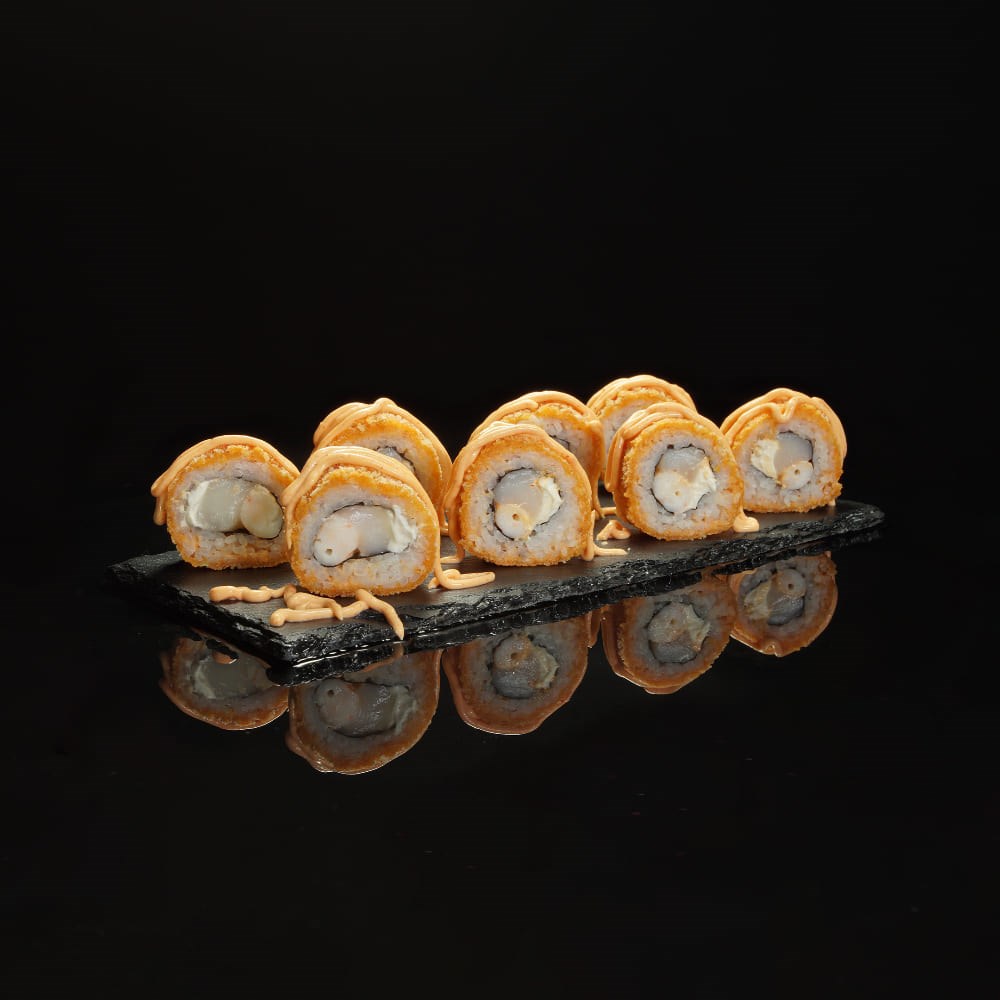 Рис, водоросли нори, сыр творожный, креветка отварная, кальмар обжаренный, кляр, сухари панировочные, соус спайси