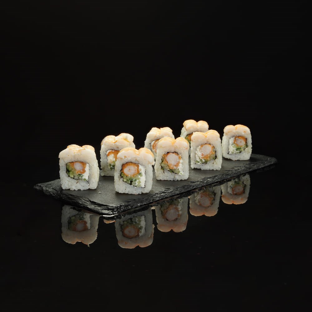 Рис, водоросли нори, сыр творожный, огурец, креветка отварная, креветка жареная