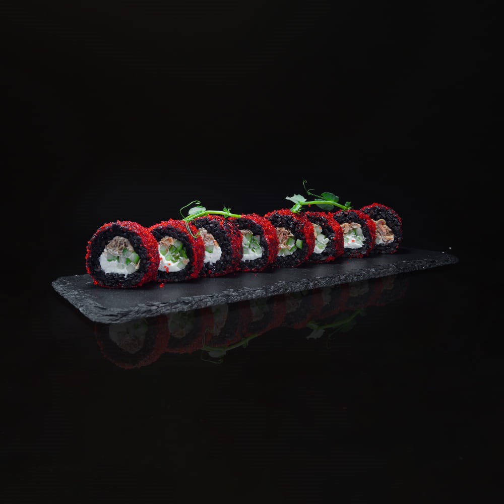 Рис черный, водоросли нори, сыр творожный, огурец, лосось терияки, икра масаго красная