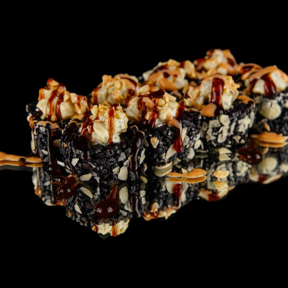 Рис черный, нори, сыр творожный, креветка темпура, огурец, миндаль лепестки, авокадо, чесночный соус, гребешок, соус унаги, соус шичими, арахис