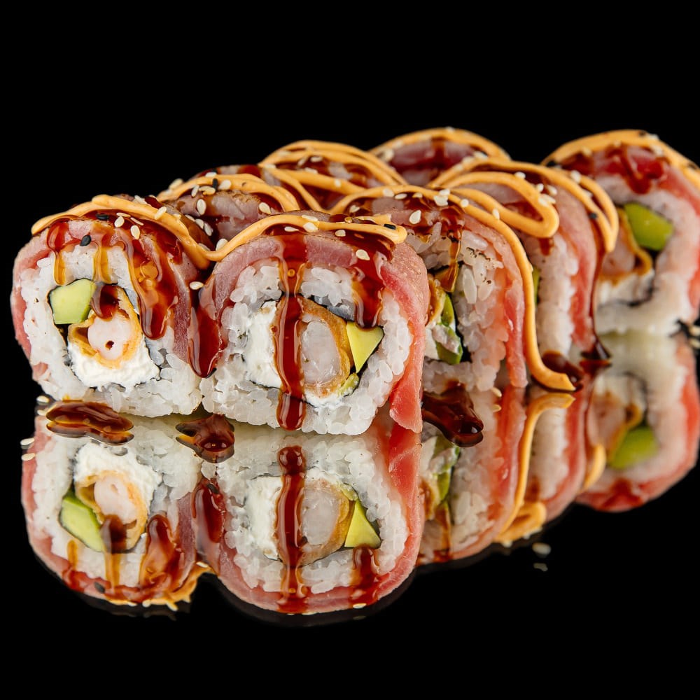 Рис, нори, креветка темпура, сыр творожный, авокадо, тунец, унаги, соус спайси, кунжут