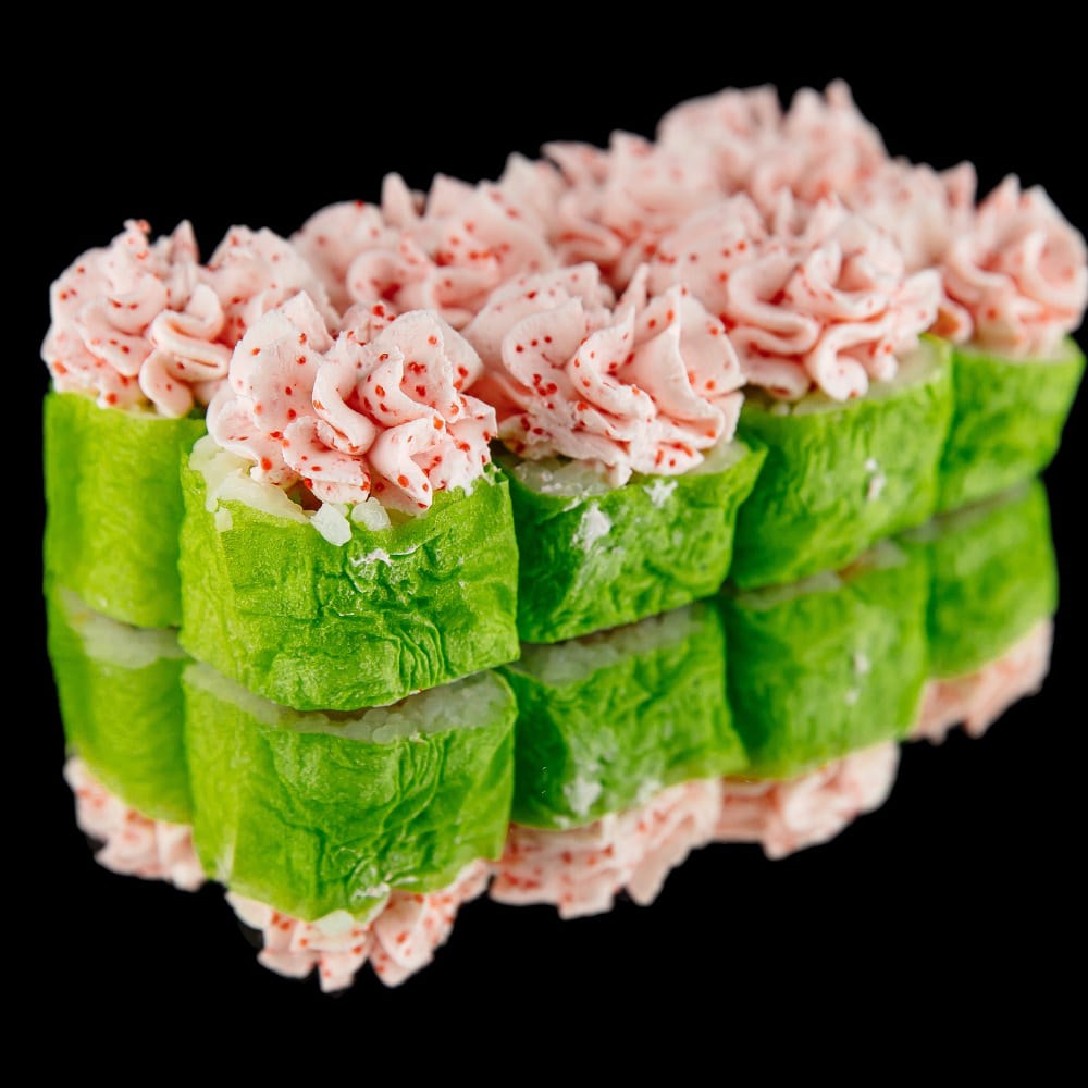 Маменори зеленый, рис, копченый лосось, огурец, сыр с масагой