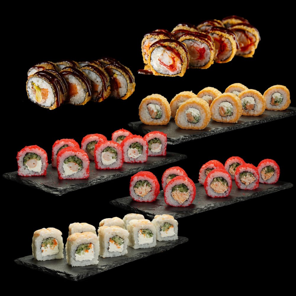 Состав: калифорния с креветкой, калифорния снежный краб, невада, филадельфия темпура, норито, ракуна