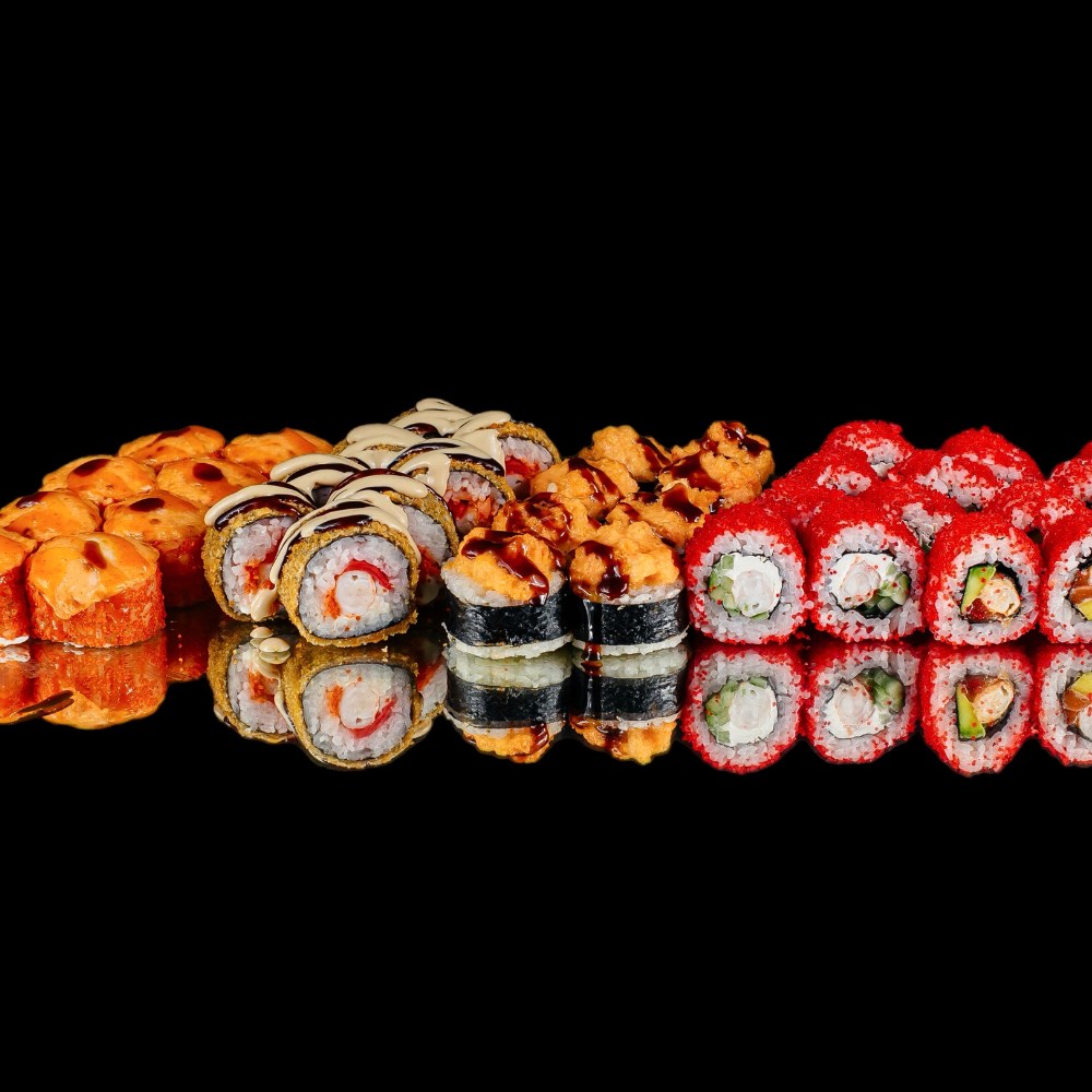 Состав: ракуна, креветка хот, монако, калифорния с креветкой, эби ролл