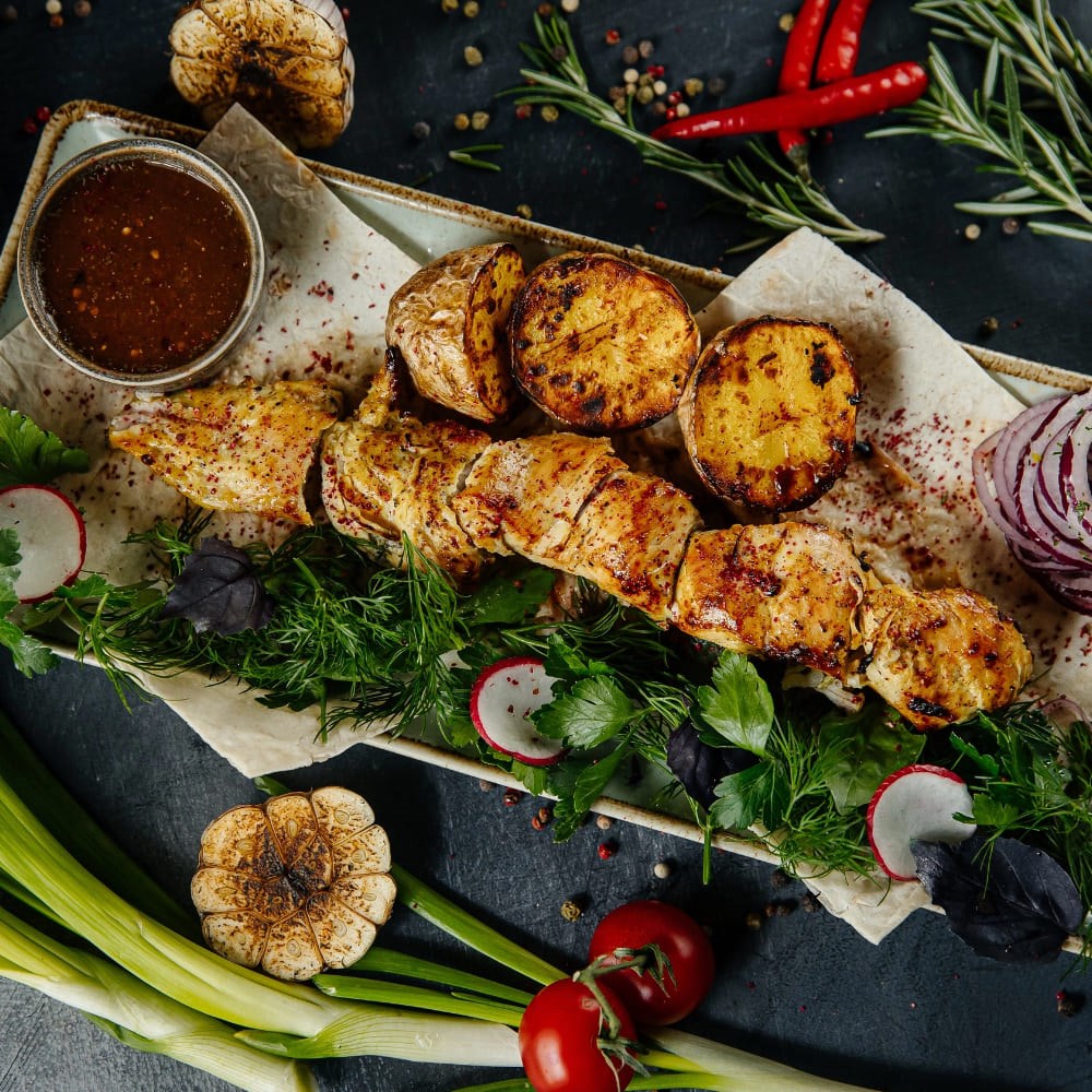 Подается с печеным картофелем, лавашем, маринованным луком, соусом Сацебели