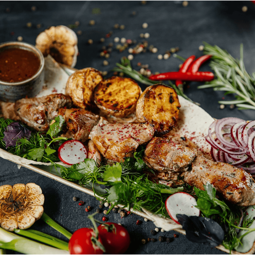Подается с печеным картофелем, лавашем, маринованным луком, соусом Сацебели