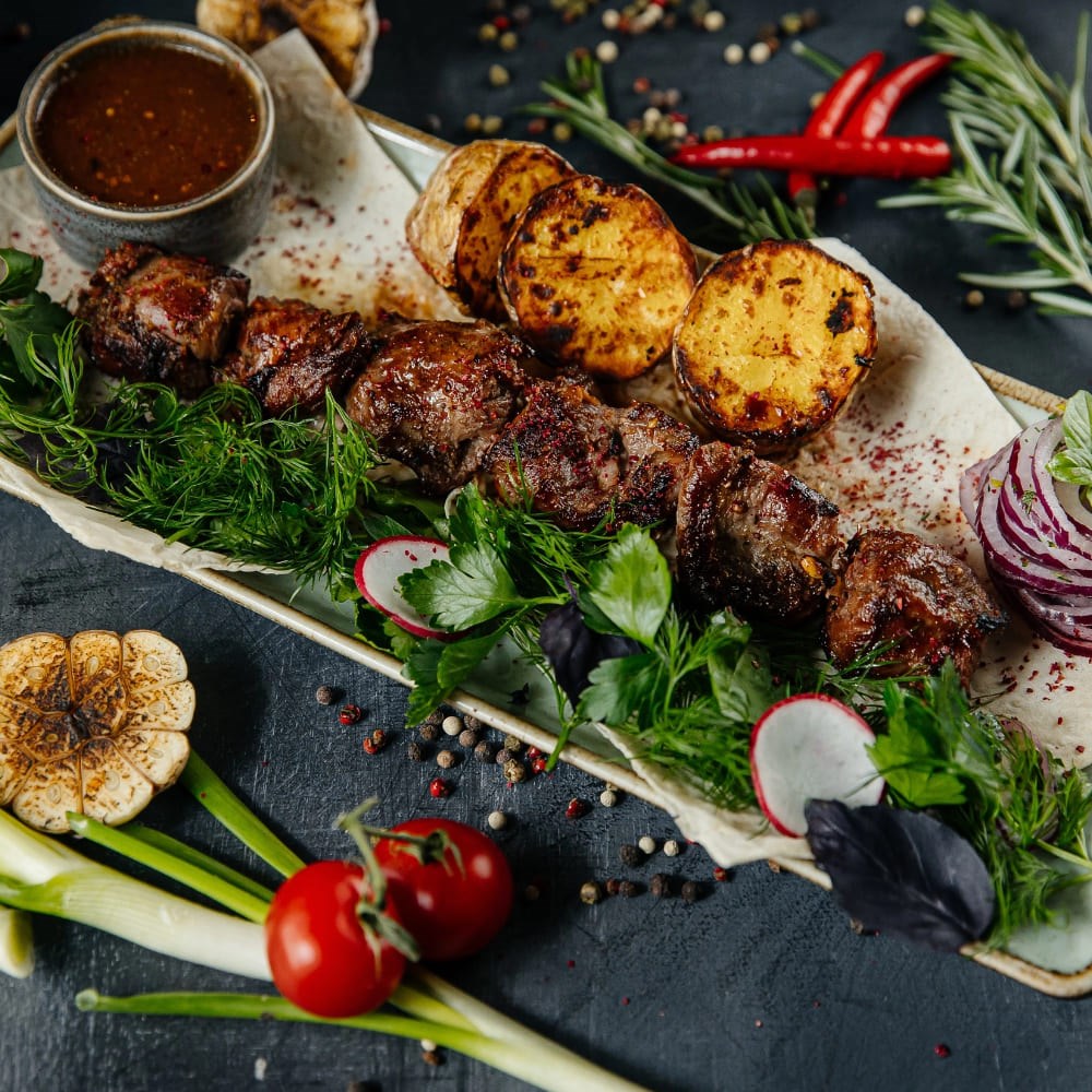 Подается с печеным картофелем, лавашем, маринованным луком, соусом Сацебели