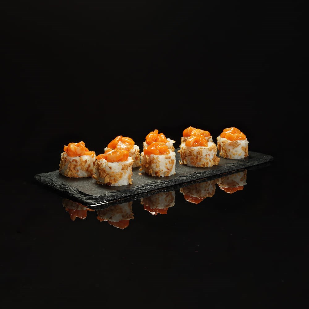 Рис, водоросли нори, сыр творожный, лук жареный, соус шрирача, лосось филе
