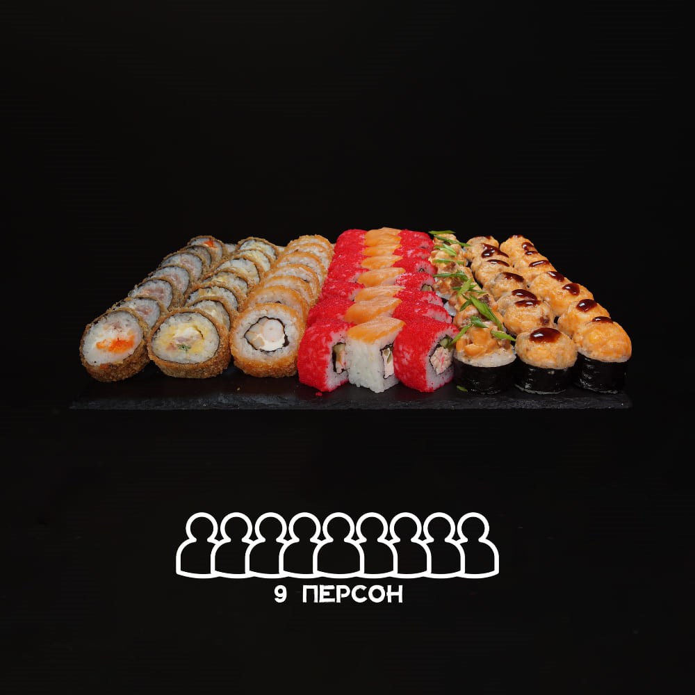 Состав: калифорния с креветкой, калифорния снежный краб, филадельфия лайт, дуэт, сырный тунец, катана, сливочный лосось, унаги хот, лосось хот