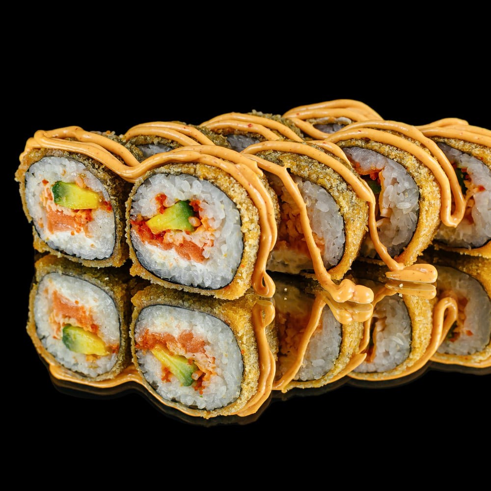 Рис, нори, сыр творожный, лосось, краб, авокадо, масаго, соус Спайси, кляр, панировочные сухари