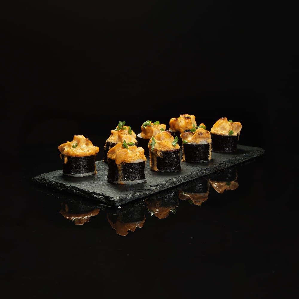 Рис, водоросли нори, сыр творожный, огурец, лосось, соус фирменный, лук зеленый