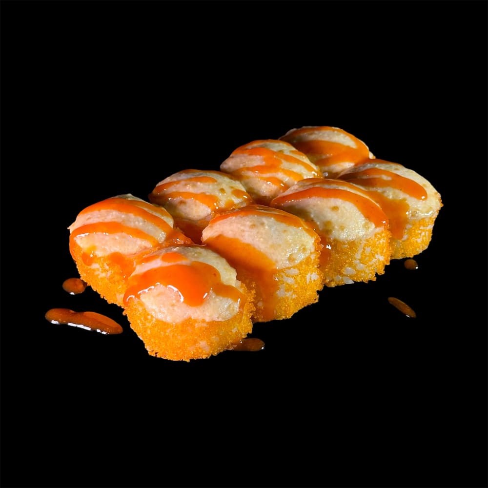 Состав: нори, рис, лосось, авокадо, сыр творожный, масаго, сырный замес, шрирача.