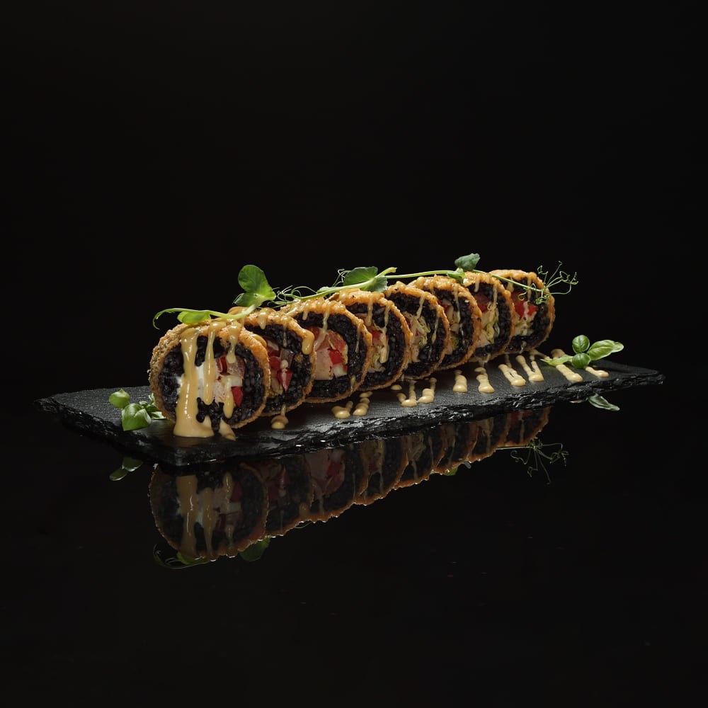 Нори, рис для суши (черный), курица копченая, сыр творожный, помидор, пекинская капуста, перец болгарский, кляр, сухари панировочные, соус тануки