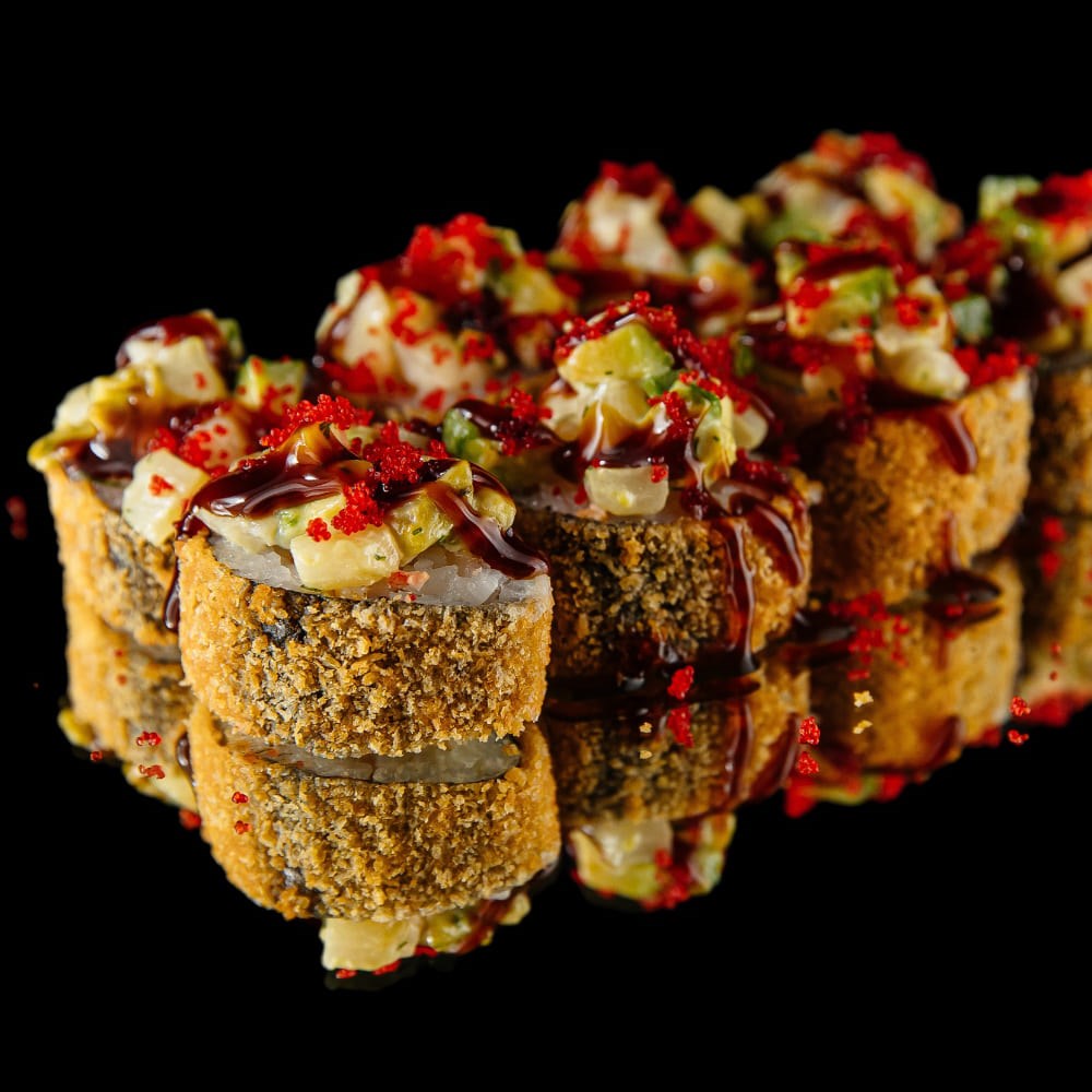 Рис, нори, сыр творожный, краб, авокадо, гребешок, чесночный соус, соус унаги, масаго красная, кунжут