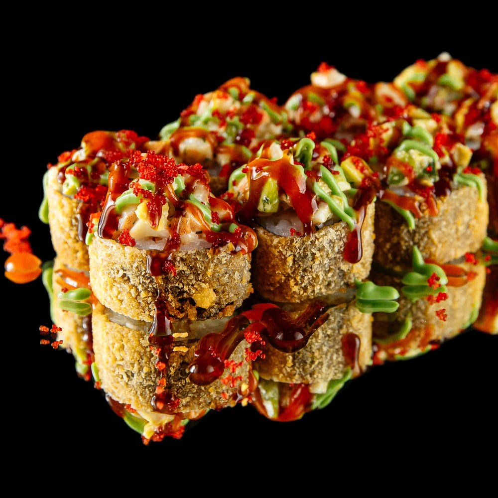 Рис, нори, сыр творожный, краб, креветка отварная, авокадо, чесночный соус, соус васаби, икра масаго, соус унаги, соус шрирача