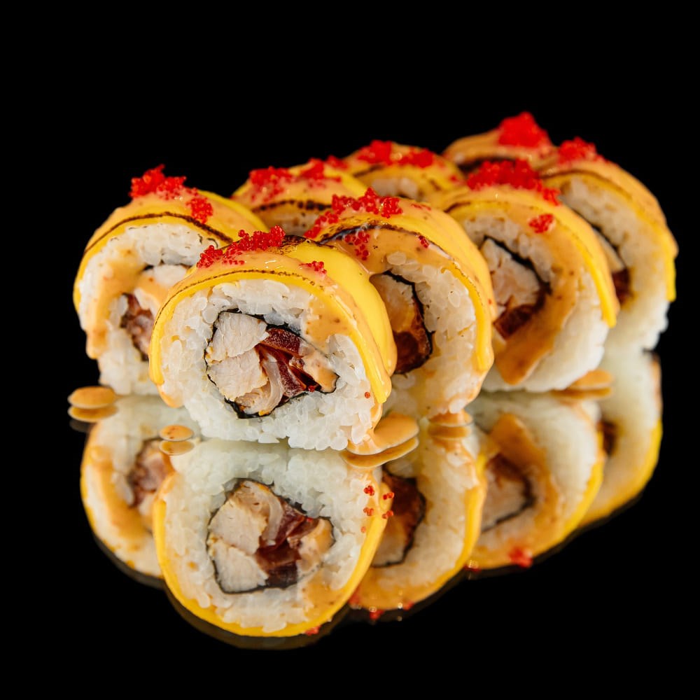 Рис черный, нори, грудка копченая, соус спайси, помидор, сыр Чеддер, соус шичими, масаго красная