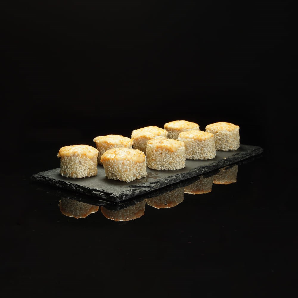 Рис, водоросли нори, сыр творожный, томаты, курица копченая, пекинская капуста, кунжут, сырный соус для запекания