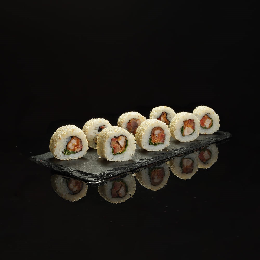 Рис, водоросли нори, соус спайси, томаты, курица жареная, лук зеленый, кунжут