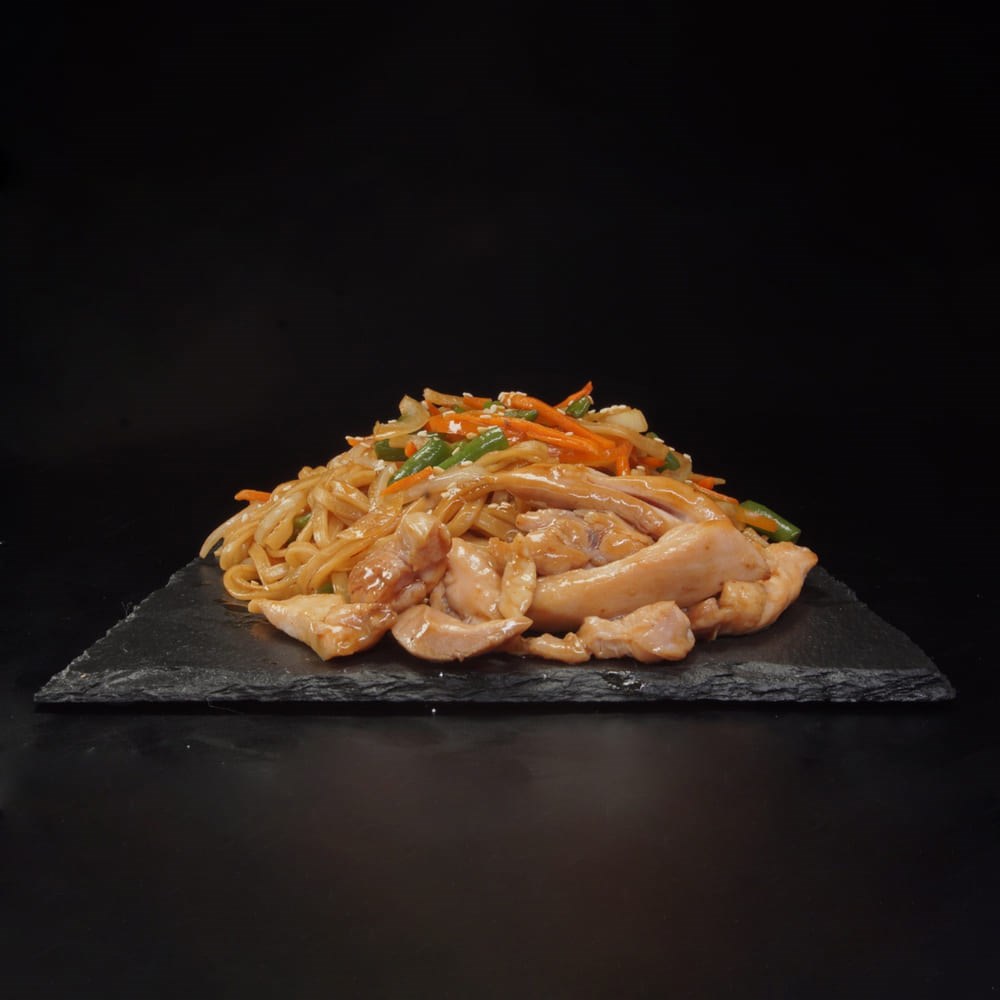 Масло подсолнечное, филе красного мяса, морковь, лук репчатый, фасоль стручковая, перец болгарский, бульон суимоно, соевый соус, лапша удон, соус на выбор, кунжут белый