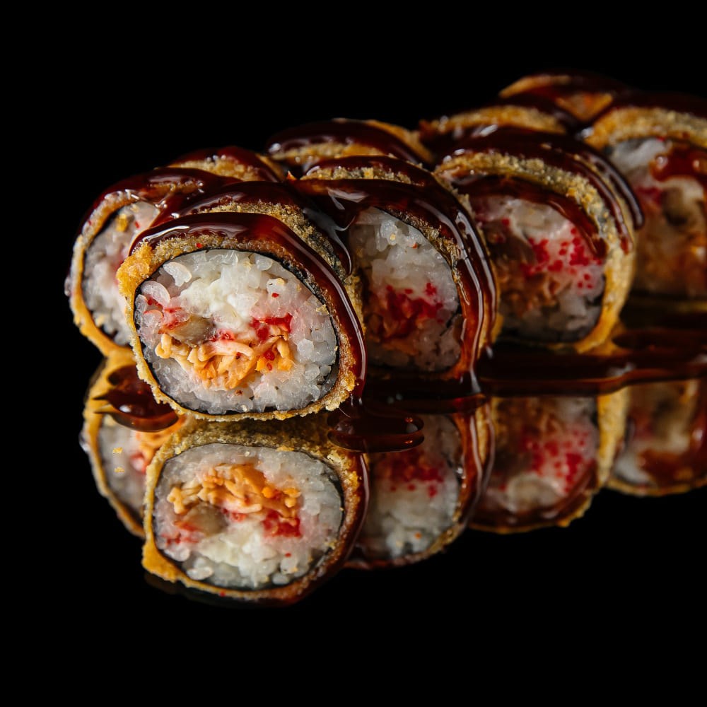 Рис, нори, сыр творожный, краб, икра масаго, кларий, соус унаги