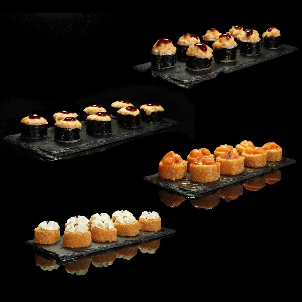 Рассвет: рис для роллов, нори, лосось терияки, сыр творожный, лук зеленый, кляр, сухари панировочные, соус сливочный чили